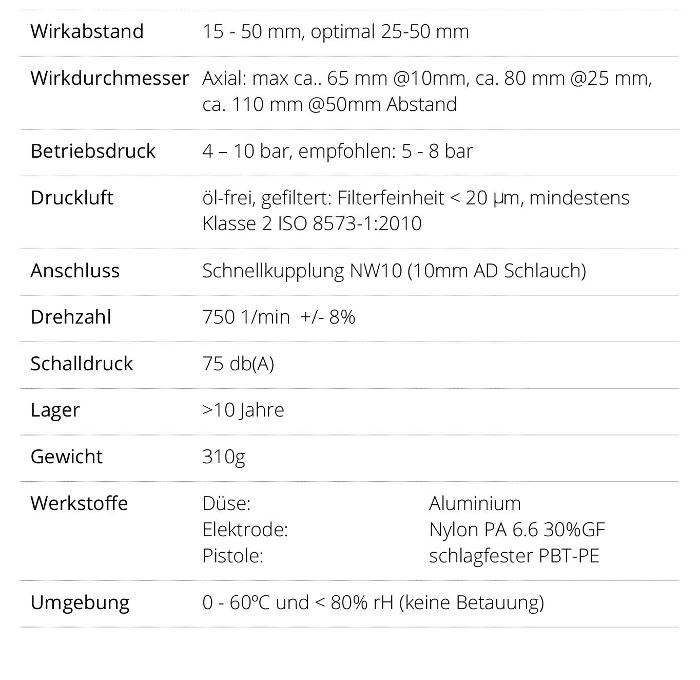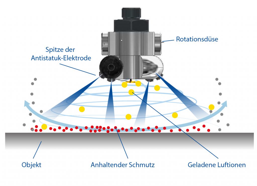Die kompakte Lösung zum ionisierenden manuellen Reinigen mit Druckluft, in allen Bereichen der Produktion. Die rotierende Ionendüse erzeugt eine pulsierende und turbulente Luftströmung und optimiert das Aufwirbeln und Ablösen der Partikel von der Oberfläche.