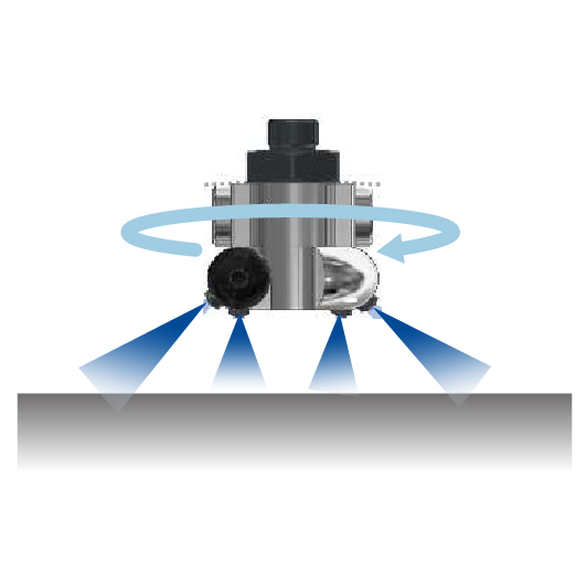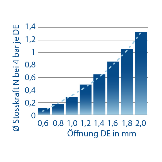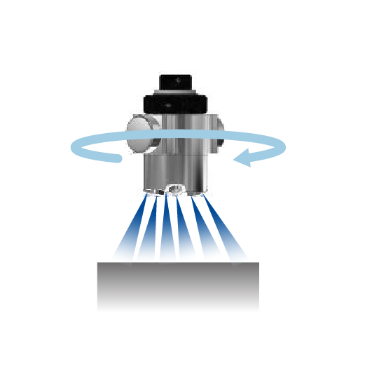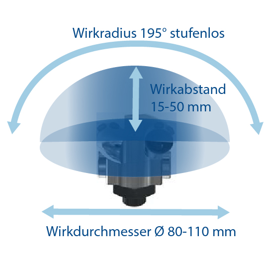 Die ehem. patentierte automatische Drehzahlregelung garantiert eine konstante und druckunabhängige Drehzahl, was eine Prozesssicherheit im automatisierten Betrieb gewährleistet. Der optimale Arbeitsabstand der Düse ist 30-50 mm.