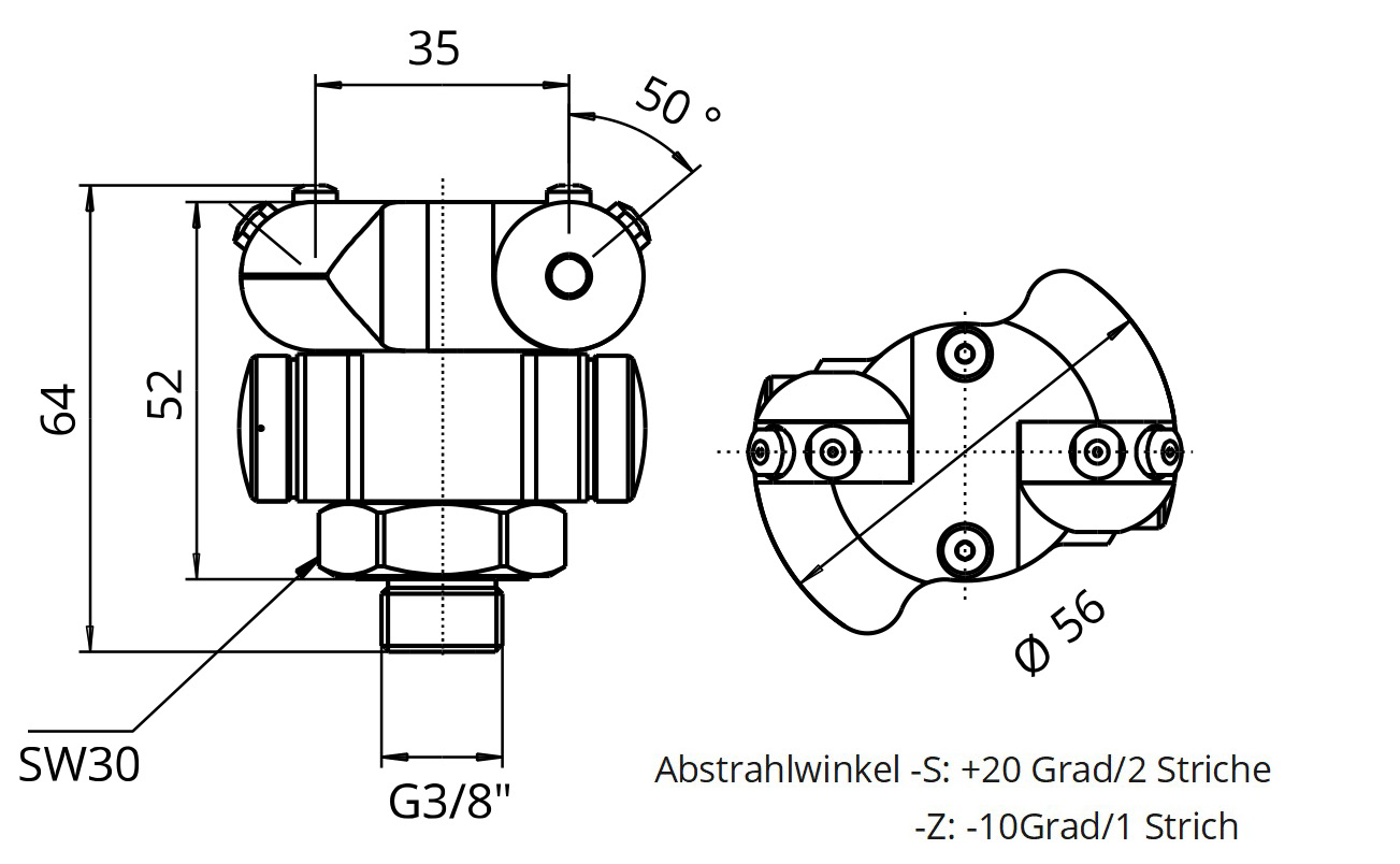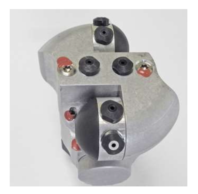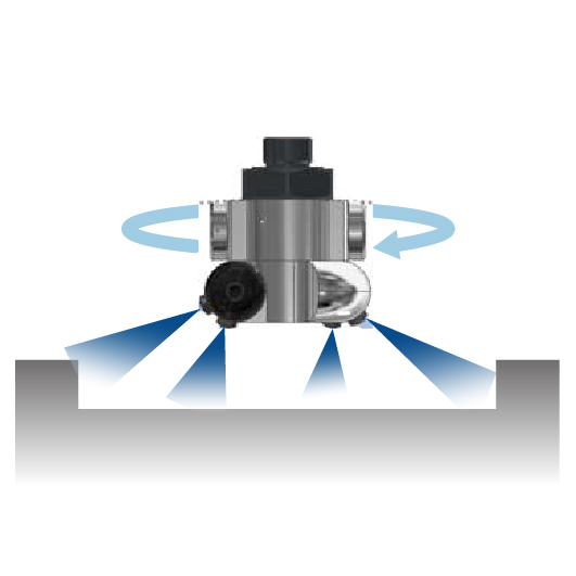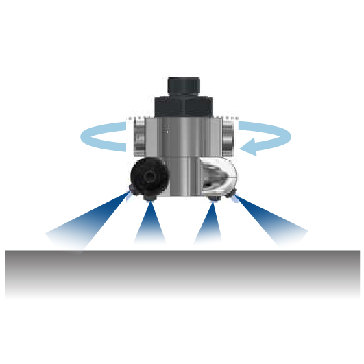 Um axiale Problemzonen wie Bohrlöcher zusätzlich zu erreichen, kann das Düsenoberteil mit 2 zusätzlichen fokussierten Zentrumsdüsen bestellt werden (0 und 8° zueinander geneigt).