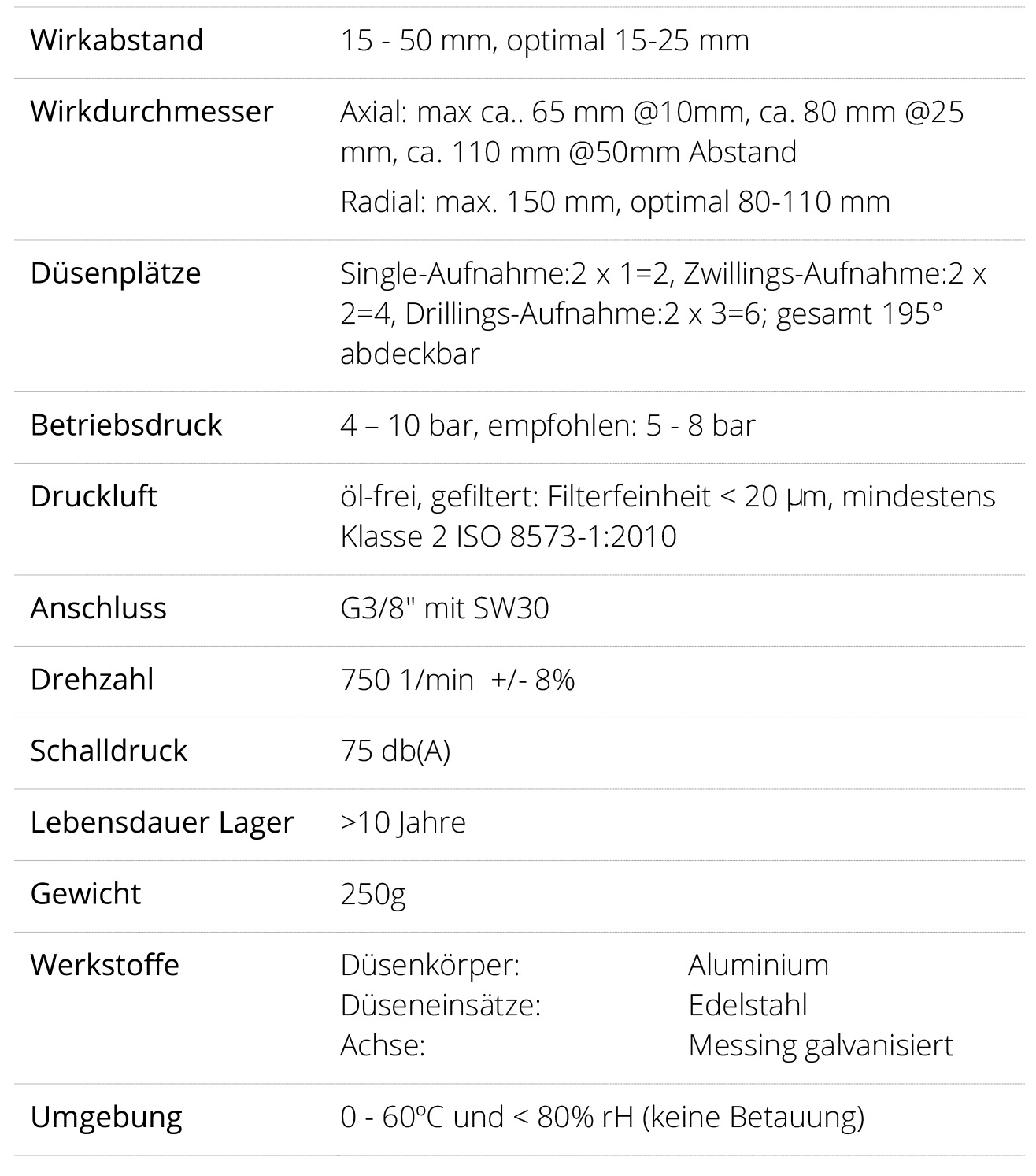 Die kompakte Lösung zum Reinigen mit Druckluft, in allen Bereichen der Produktion – nachhaltiger und weniger aufwendig als Nassreinigung. Die rotierende Druckluftdüse erzeugt eine pulsierende und turbulente Luftströmung und optimiert das Aufwirbeln und Ablösen der Partikel von der Oberfläche.