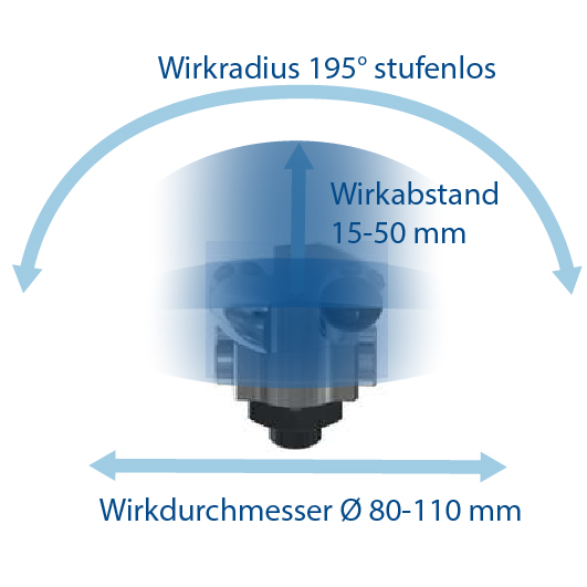 Um die Wirkfläche zu erhöhen sind Düsenaufnahmen mit einer, zwei oder drei Düseneinheiten wähl- und nachrüstbar.