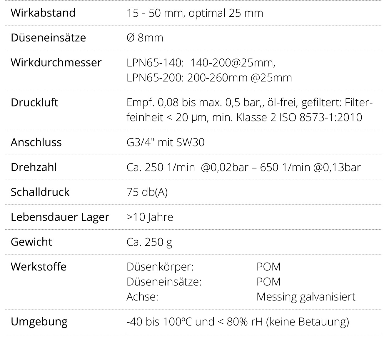 Die LPN65 ist für eine Reinigung von größeren Flächen mit Gebläseluft im Durchlauf konstruiert – viel mehr Luftvolumen bei sehr kleinem Druck (üblicherweise Gebläse/ Seitenkanalverdichter) ganz ohne Kompressor.