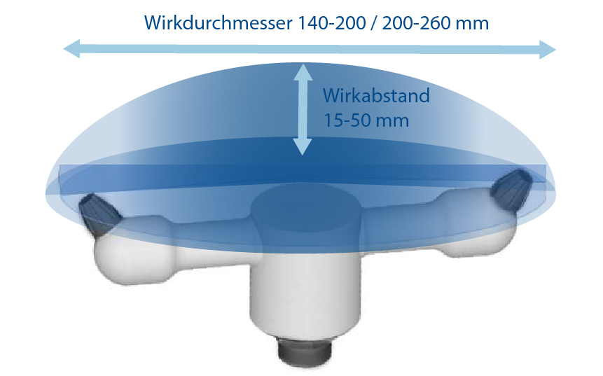 Die rotierende Luftdüse erzeugt eine pulsierende und turbulente Luftströmung und optimiert das Aufwirbeln und Ablösen von sehr leichten und losen Partikeln zB. Aus Holz oder Papier von der Oberfläche (nur bedingt geeignet für Metallspäne). Die Düse ist aus leichtem korrosionsbeständigen Kunststoffmaterial in den Breiten 140 und 200 mm gefertigt.