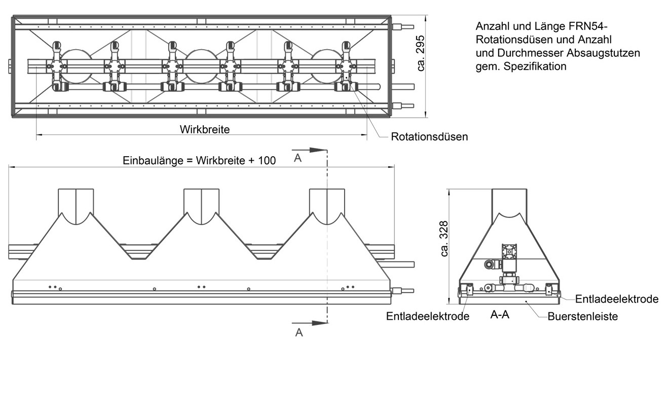 Bei statisch aufgeladenen Materialien, werden beim Ein- und Auslauf im Gehäuse durch Entladeelektroden die Oberfläche und die Partikel neutralisiert (in Grafik gelbe Luftteilchen) und eine Anhaftung gelöst bzw. Neuanhaftung verhindert.