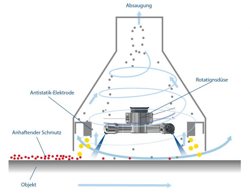 Durch die pulsierende Luft der Rotationsdüsen werden die an der Oberfläche anhaftenden Partikel aufgewirbelt und über den strömungsoptimierten Absaugtrichter entfernt.