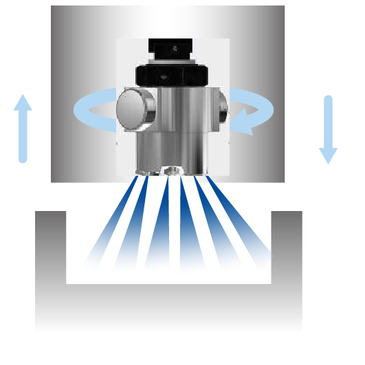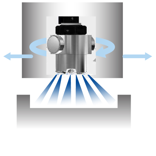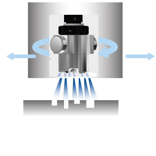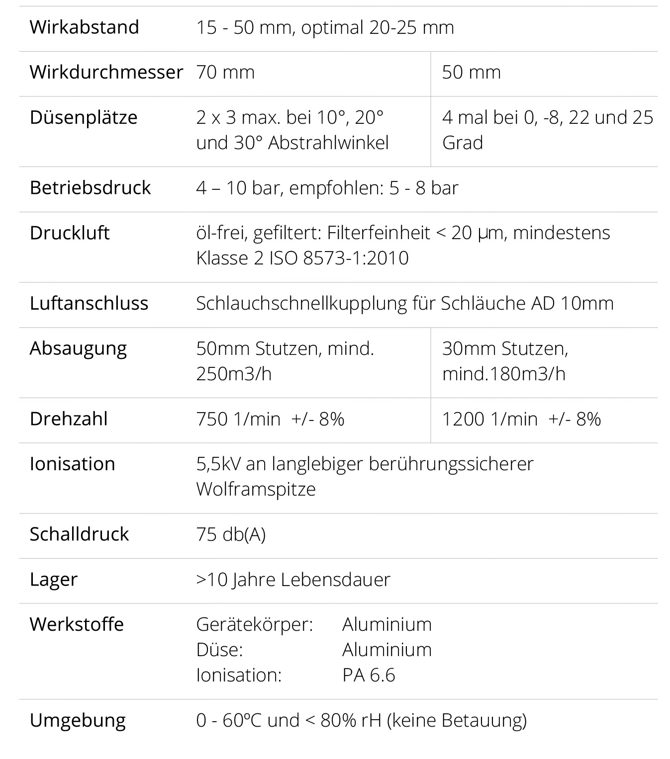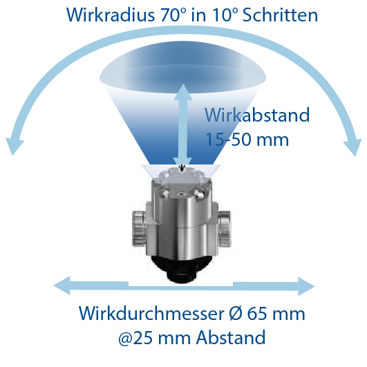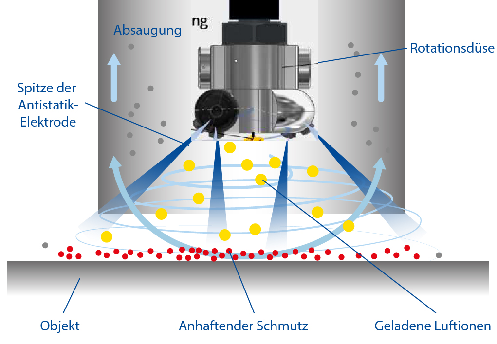 Der CombiCleaner-DM kombiniert Blasdüse und Absaugtrichter zu einer Gesamtlösung. Es eignet sich nicht nur zm stationären intensiven reinigen, sondern kann auch an Führungen oder Roboterarmen befestigt Flächen und Konturen abreinigen. Die rotierende Ionendüse erzeugt eine pulsierende und turbulente Luftströmung und optimiert das Aufwirbeln und Ablösen der Partikel von der Oberfläche bei gleichzeitigem Absaugen.