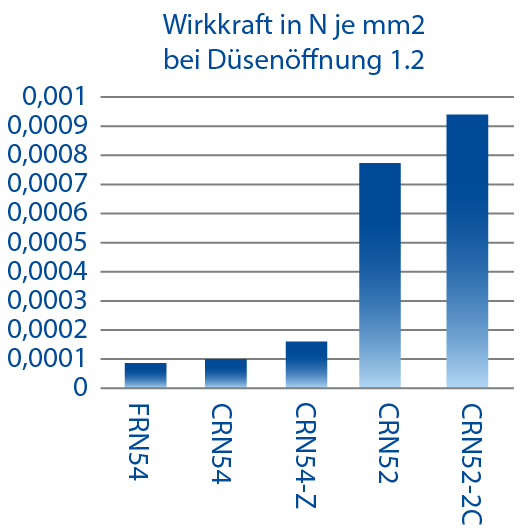 sind die Öffnungen der Düseneinheiten auf eine kleinere Fläche fokussiert, siehe Wirkkraft je mm² im Vergleich mit anderen Düsentypen in Grafik.